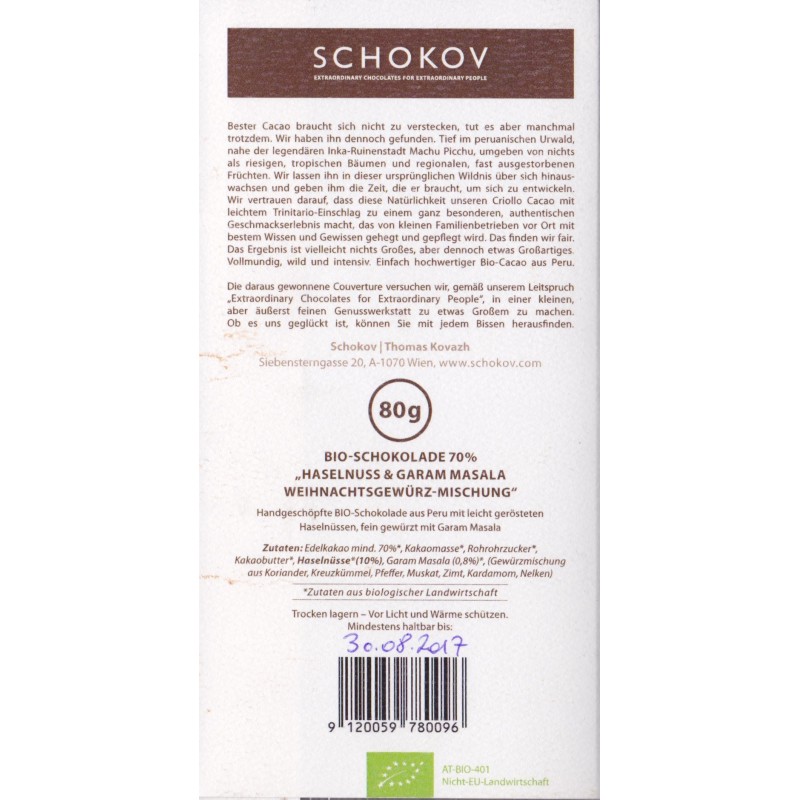 Zutaten: Edelkakao mind. 70%*, Kakaomasse*, Rohrohrzucker*, Kakaobutter*, Haselnüsse* (10%), Garam Masala ((0,8% - Gewürzmischung aus Koriander, Kreuzkümmel, Pfeffer, Muskat, Zimt, Kardamom, Nelken).