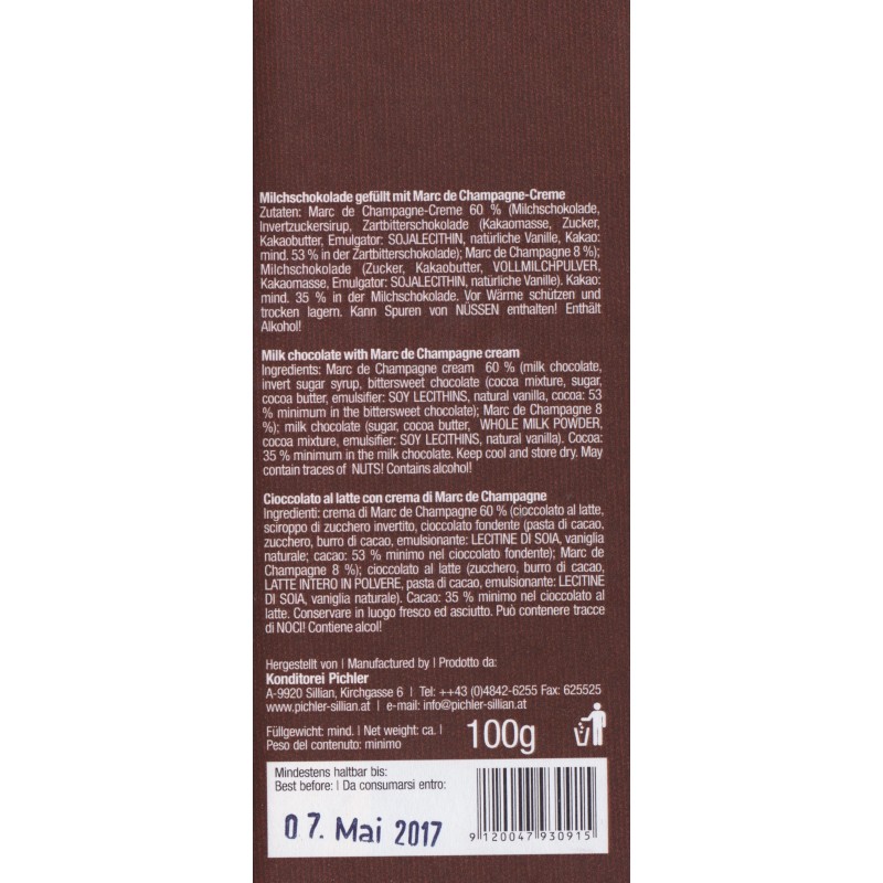 Zutaten: Marc de Champagne-Creme 60 % (Milchschokolade, Invertzuckersirup, Zartbitterschokolade (Kakaomasse, Zucker, Kakaobutter, Emulgator: SOJALECITHIN, natürliche Vanille, Kakao: mind. 53 % in der Zartbitterschokolade); Marc de Champagne 8 %); Milchschokolade (Zucker, Kakaobutter, VOLLMILCHPULVER, Kakaomasse, Emulgator: SOJALECITHIN, natürliche Vanille). Kakao: mind. 35 % in der Milchschokolade.